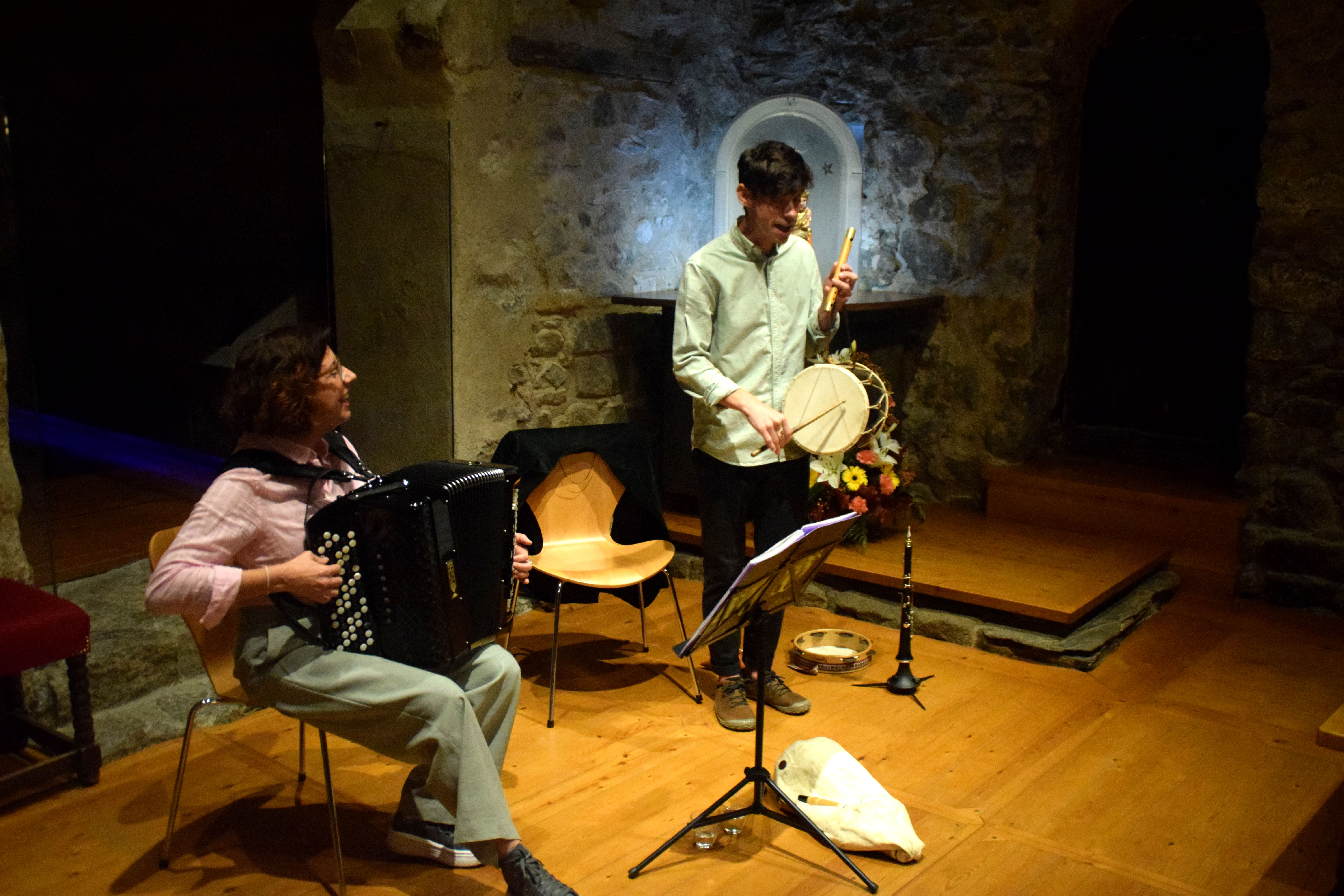 Duet Daura intenta donar a conèixer la música tradicional del Pirineu i ho fa també aportant nous sons i melodies. A banda d’això, en algunes cançons han recuperat instruments que han quedat en desús. “Toquem música tradicional del Pirineu amb instruments tradicionals que molts d’ells eren originàriament del Pirineu i que amb el pas dels anys s’han perdut, com per exemple el bot d’Aran, que és un instrument que es tocava a la Vall d’Aran”, ha comentat el músic del Duet Daura, Ivan Caro. El públic que ha omplert l’església de Santa Coloma també ha pogut escoltar el flabiol, la gralla, l’ocarina o el tamborí, “que va tenir molta presència en el Pirineu, però amb l’aparició de l’acordió va desaparèixer”, ha esmentat Caro. En aquest sentit, el duet combina l’acordió amb els instruments de vent “que tan importants van ser pel Pirineu”, ha comentat Caro, que ha afegit que la música pirinenca era “alegre perquè s’utilitzava per anar més enllà de la feina i dels problemes”.
