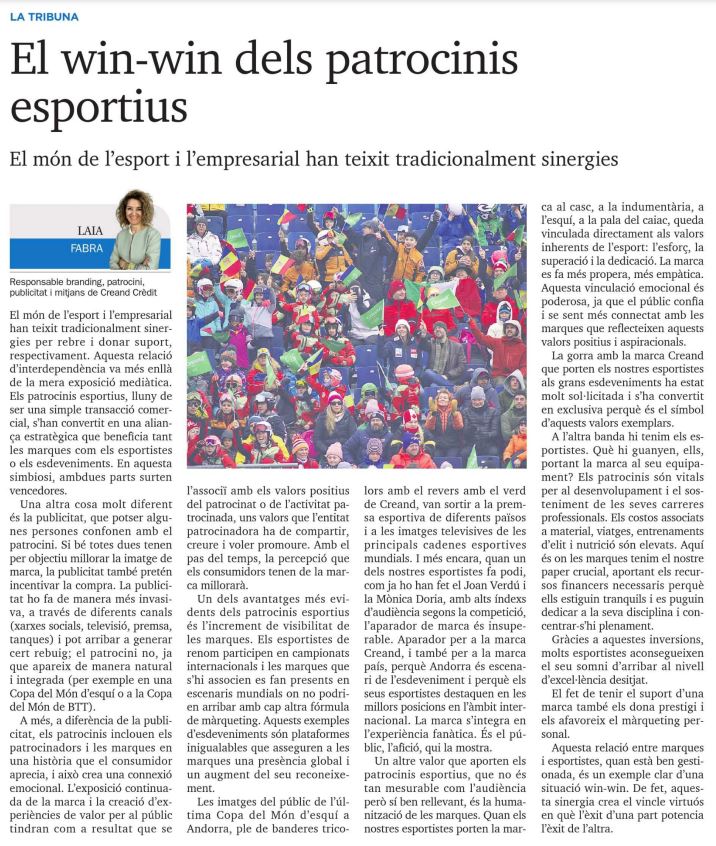 The images of spectators at the most recent Ski World Cup in Andorra, waving tricolour flags with the green of Creand on the back, appeared in sports publications in numerous countries and in television broadcasts by the world’s leading sports networks. On top of that, when our own sportspeople – like Joan Verdú and Mònica Doria – make the podium, watched by large audiences (depending on the competition), this provides an unbeatable showcase: not only for the Creand brand, but also for the country’s brand as a whole, as Andorra is the stage for the event and its sportspeople stand out in the top rank at the international level. The brand is thus integrated into the fan experience and it is the fans themselves who advertise it.