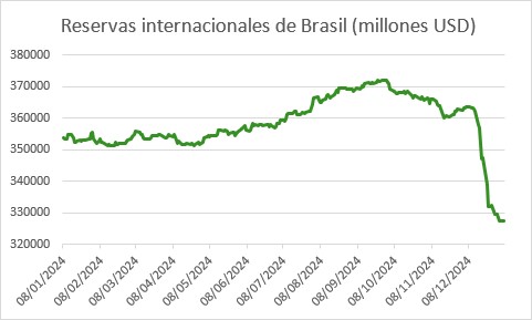 2024 ha sido un año muy difícil para los mercados financieros en Brasil. En primer lugar, su moneda, el real brasileño, tocaba el pasado mes de diciembre el nivel más bajo de su historia con respecto al dólar, depreciándose un 27,35 % durante el período. Por otro lado, los bonos emitidos por el Gobierno han visto como su tipo de interés se ha disparado superando el 15 %, niveles no vistos desde 2016.