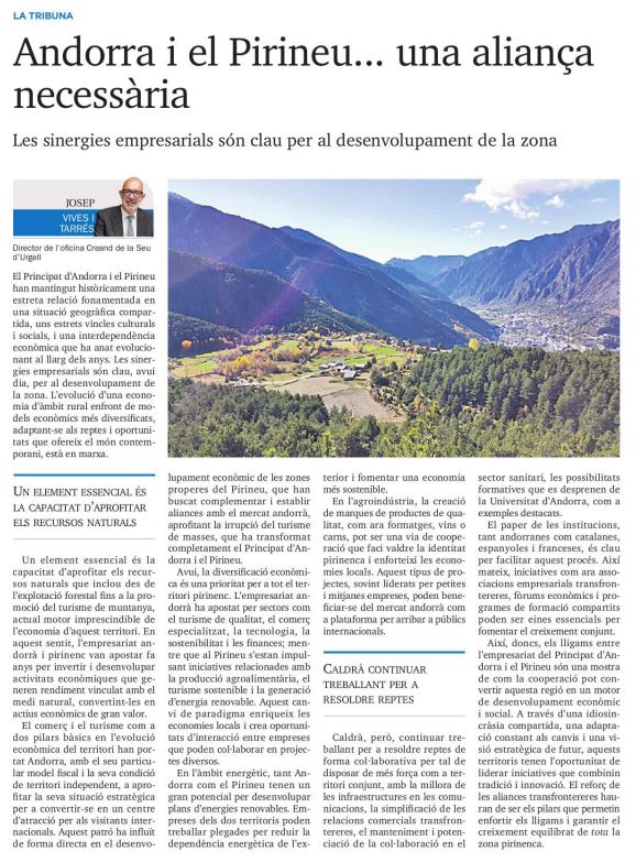 Ainsi, les liens entre les entreprises de la principauté d’Andorre et des Pyrénées sont un exemple de la manière dont la coopération peut faire de cette région un moteur du développement économique et social. Grâce à une idiosyncrasie partagée, une adaptation constante au changement et une vision stratégique de l’avenir, ces territoires ont l’opportunité de mener des initiatives qui allient tradition et innovation. Le renforcement des alliances transfrontalières doit être le pilier qui permettra de renforcer les liens et de garantir une croissance équilibrée de l’ENSEMBLE de l’espace pyrénéen.