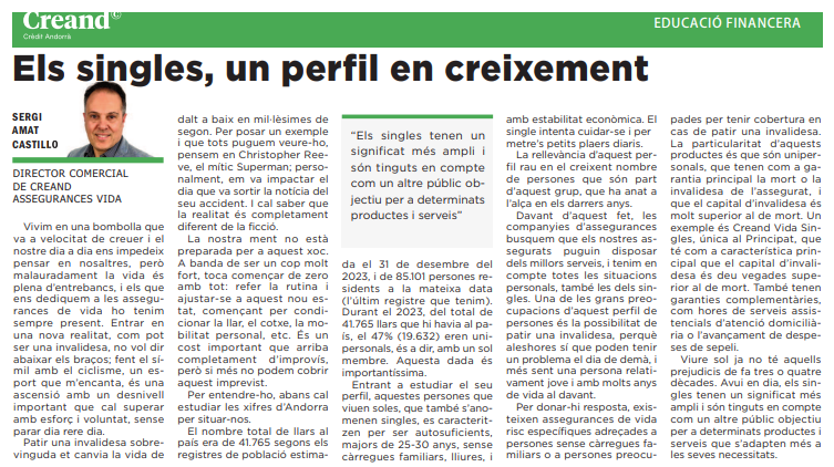 Pour répondre à ce besoin, il existe des contrats d’assurance-vie à risques spécifiques destinés aux personnes sans charges familiales ou aux personnes soucieuses d’être couvertes, notamment en cas d’invalidité. La particularité de ces produits est qu’ils sont unipersonnels, que leur garantie principale est le décès et l’invalidité de l’assuré/e, et que le capital invalidité est bien supérieur au capital décès. Creand Vida Singles en est d’ailleurs un clair exemple : un produit, unique en Andorre, dont la principale caractéristique est que le capital invalidité est 10 fois supérieur au capital décès. Il compte également des garanties complémentaires telles que le paiement anticipé des frais funéraires et des heures de services d’aide à domicile.