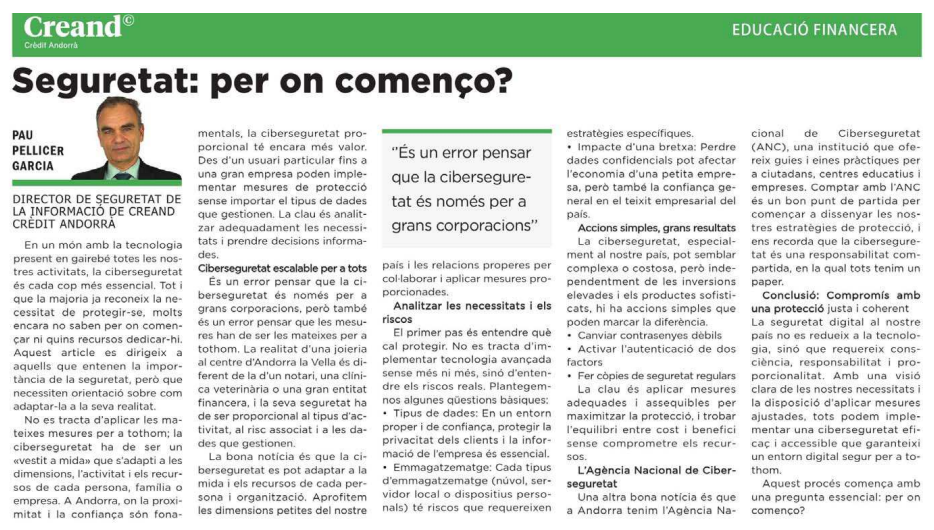 Une autre bonne nouvelle, c’est que l’Andorre dispose de l’Agence nationale de cybersécurité (ANC), une institution qui fournit conseils et outils pratiques aux particuliers, aux établissements scolaires et aux entreprises. Compter sur l’ANC est un bon point de départ pour commencer à concevoir nos stratégies de protection, et cela nous rappelle que la cybersécurité est une responsabilité partagée, où nous avons tous un rôle à jouer.