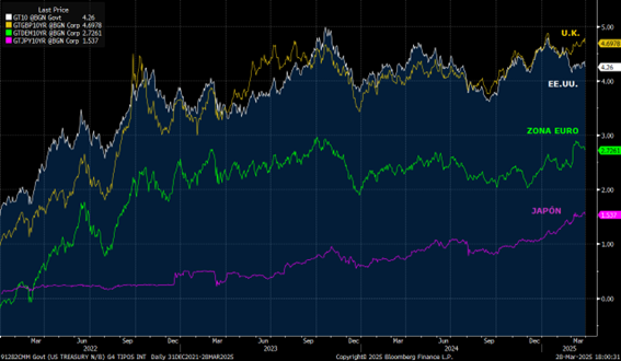 Quant als tipus d’interès, destaca l’augment del rendiment del Bund en 43 pb la primera setmana de març, que és l’increment setmanal més gran des de la unificació alemanya el 1990. Va ser degut als anuncis de la UE sobre els plans per augmentar la inversió en defensa (800.000 M), i d’Alemanya, que proposava una reforma constitucional per augmentar significativament la despesa pública amb plans en defensa i infraestructures. Mentrestant, el Treasury a10 anys abaixava la seva rendibilitat davant els temors d’un creixement menor als EUA, secundat per unes males dades de confiança del consumidor.