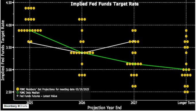 Els bancs centrals continuen amb un ritme diferent fins a arribar al seu tipus terminal. La Reserva Federal (19/03/2025) va mantenir la seva taxa de fons federals sense canvis (4,25-4,5%). El gràfic de punts que elaboren els seus membres mostrava que la mitjana dels membres del FOMC encara espera dues retallades el 2025, mentre que el mercat n’espera fins a tres. Van revisar a l’alça la inflació subjacent del 2025, +0,3%, i el creixement, en canvi, a la baixa, -0,4% (canviant, per tant, cap a més estagflació). Powell va dir que la política monetària es troba en una «bona posició» i que no hi ha pressa per retallar les taxes.
