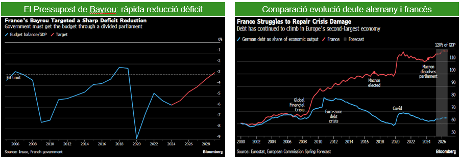 Fitch, per la seva part, va rebaixar la qualificació a llarg termini de França de AA- a A+. La perspectiva es manté estable. Aquesta decisió reflecteix: 1) Una ràtio de deute elevada i en augment; la ràtio de deute de França per al 2024 és ara la tercera més alta entre els països amb qualificació A i AA. 2) Que la fragmentació política dificulta la consolidació fiscal. Fitch considera improbable arribar a un dèficit del 3% el 2029. Això inclou un historial deficient de consolidació fiscal i compliment de les normes fiscals de la UE. És la primera agència de qualificació creditícia que rebaixa la qualificació de França dins el grup de les A, i tenim pocs dubtes que les altres agències seguiran el seu exemple a curt/mitjà termini per les mateixes raons esmentades per Fitch, llevat que aconsegueixi algun acord polític que presenti uns plans fiscals clars i creïbles. Si no és així, el deute públic francès mantindrà una tendència a l’alça i preveiem que pot créixer 10 punts percentuals el 2030 i superar el 120%. El dèficit públic francès es mantindrà elevat i dista molt del seu nivell d’estabilització (5,5% previst per al 2025 davant el 2,8% necessari per estabilitzar el nivell de deute públic).