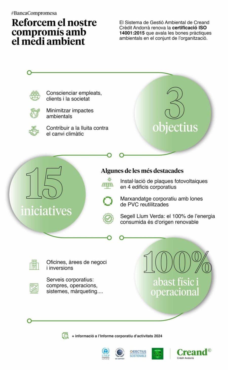 Creand Crèdit Andorrà, a través del Sistema de Gestió Ambiental, ha renovat la certificació de gestió ambiental segons la norma ISO 14001:2015 per als tres anys vinents (2025-2027).