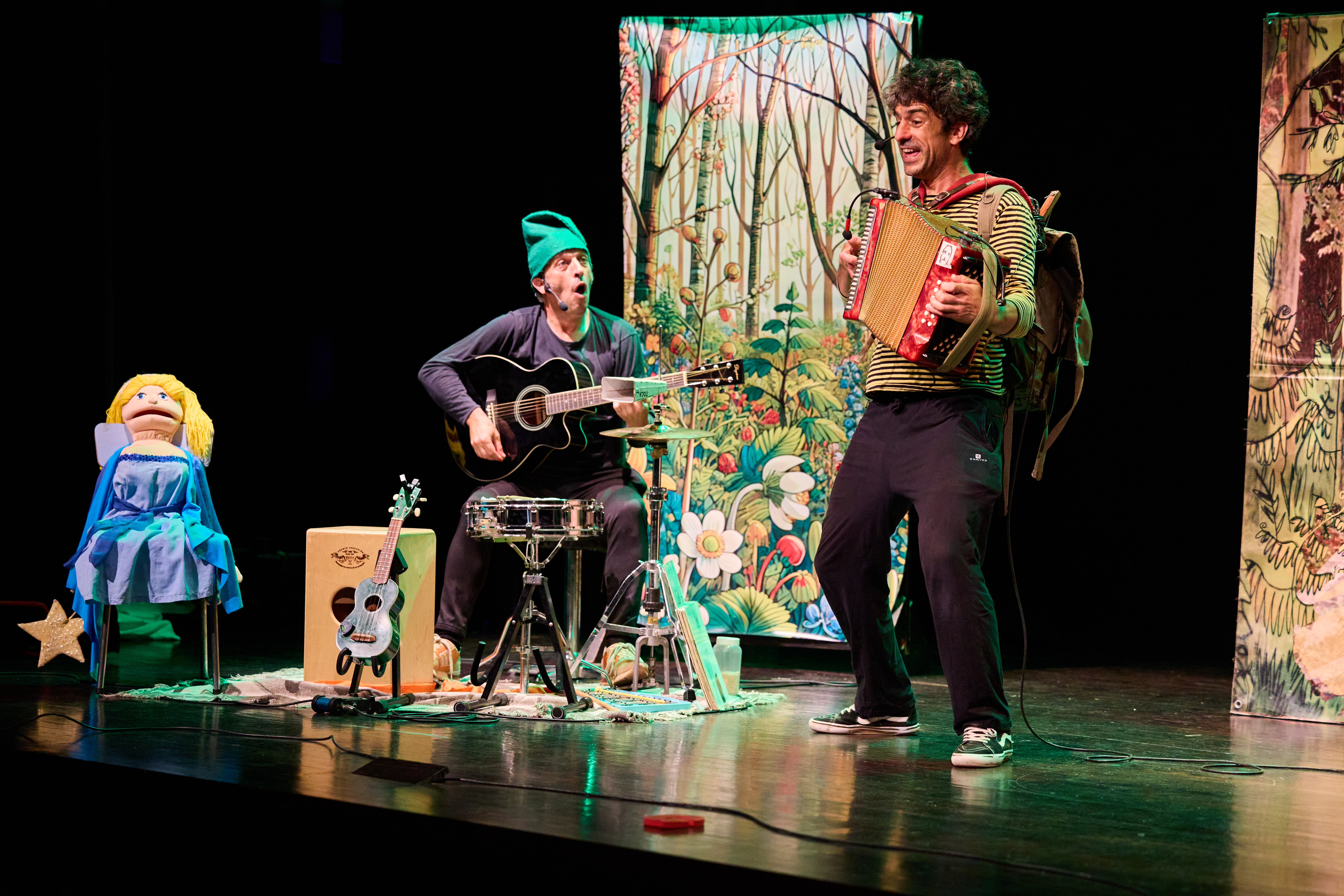 Amb El batec del bosc La Maquineta ha convidat el públic que ha omplert el teatre de les Fontetes a submergir-se en un bosc viu, on els sons de la natura es transformen en ritmes, melodies i emocions. A través de la música interpretada en directe amb bateria, acordió i guitarra, i amb una acurada posada en escena de llums i escenografia, la companyia construeix un viatge que estimula l’escolta, la imaginació i el respecte pel nostre entorn. El protagonista, el Guim, ha guiat els més petits en la descoberta de la música. “Els nens, normalment amb aquesta obra, es queden sorpresos de veure els instruments en directe i van agafant sensibilitat amb la música i aprenen conceptes bàsics com el tempo, les blanques, rodones, negres, les intensitats, els volums…”, han explicat des de la companyia, que argumenten que l’espectacle és una manera “d’introduir els conceptes bàsics de la música a través d’un petit conte”.